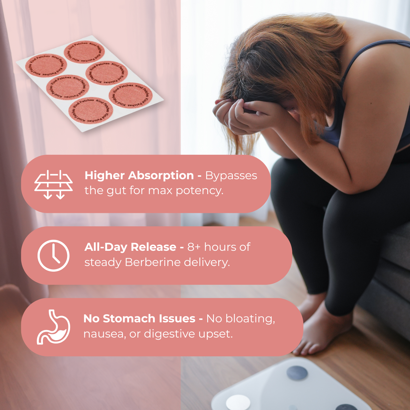 Calcie Patches are powered by pure Berberine—a natural compound shown to activate GLP-1, regulate blood sugar, and boost fat metabolism. But unlike pills, we don’t make you digest it. Our transdermal delivery system skips the gut entirely, releasing Berberine directly into your bloodstream over 8+ hours. That means faster onset, higher absorption, and no side effects